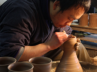 400年~500年前から会津地方に伝わる縁起のよい人形『起上がり小法師』。直径3cmほどの小さな体には、決して倒れないようにという願いが込められている。会津若松市内でも『起上がり小法師』を手作りしているのはここだけだ。制作体験も行っている(4月~10月のみ、2~3日前までに要予約)。 初市の出店に並ぶ倒れない会津の縁起物